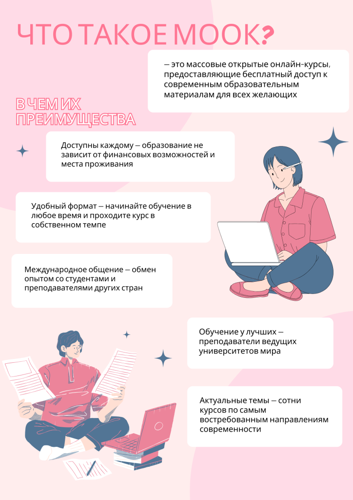 МООК – это открытые онлайн курсы, предоставляющие БЕСПЛАТНЫЙ доступ к образовательным материалам. МООК обладают рядом преимуществ: